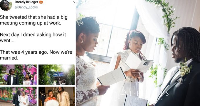 According to the groom, with the handle, @dandy_locks who shared the lovely photos of himself and his lady on their big day, he sent her a dm asking her how a ‘big’ meeting she went for at her office went and the rest is history!