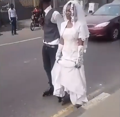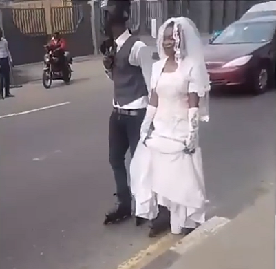 A young man and a lady believed to be newlyweds, caused quite a stir recently in Lagos when they were spotted doing something unusual yet unique on their special day.