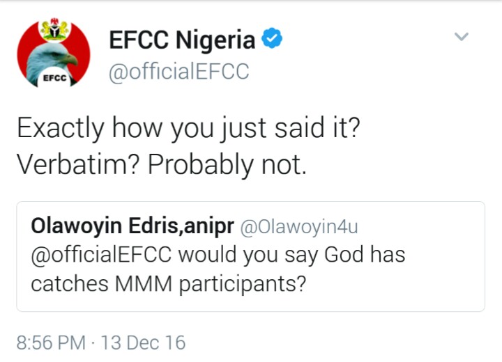 Though, Nigerians are against EFCC’s sarcastic way of replying.. They say the Account is a National one and it should be professional in its tweets.