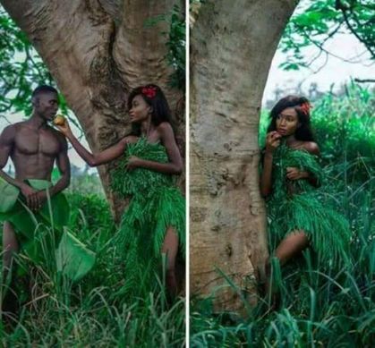 The couple are reportedly from Akokwa in Imo State, according to Ifeanyi Orakwe who shared it on Facebook – the thought on everyone’s mind who views this photo is if indeed they’re only covered by leaves…