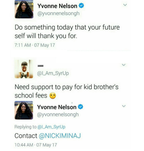 …and then one of her fans, with the handle, @i_am_syrup then quickly used that opportinuty to request for assistance on his kids brothers school fees.. Since of course, that’d seem like a pretty good thing her future self will thank her for.