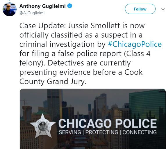 Giving a status update on the case, Chicago Police spokesperson, Anthony Gugliemi tweeted, ‘Jussie Smollett is now officially classified as a suspect in a criminal investigation by #ChicagoPolice for filing a false police report (Class 4 felony). Detectives are currently presenting evidence before a Cook County Grand Jury’.
