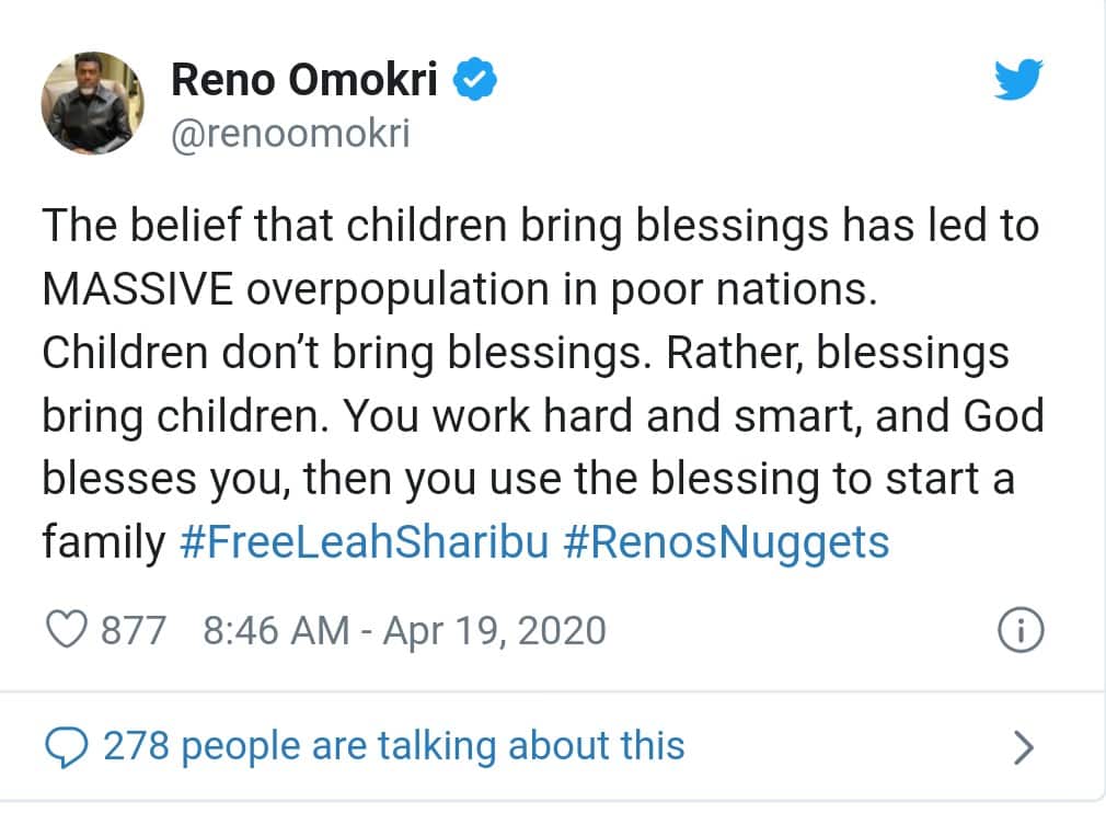 Social media commentator, Reno Omokri has spoken against the popular African mentality that children bring blessing to a family.