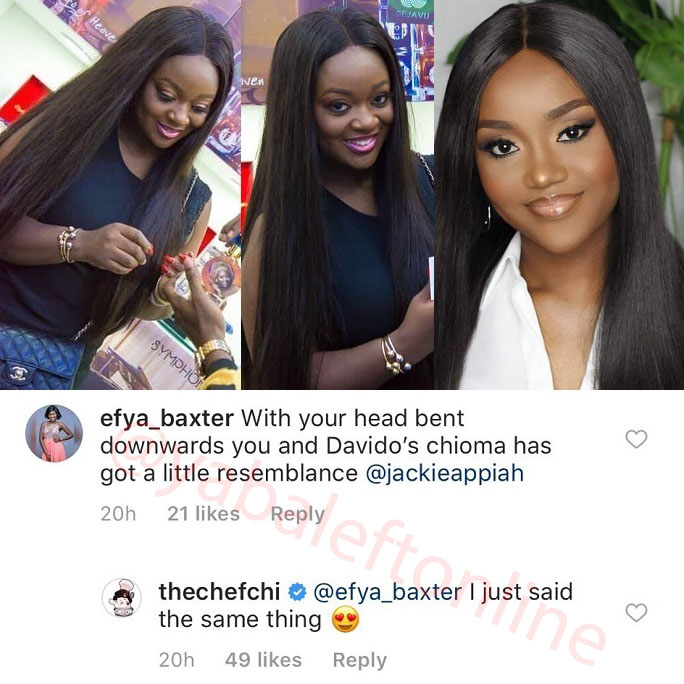 The fan wrote, With your head bent downwards you and Davido’s chime has got a little resemblance @jackieappiah