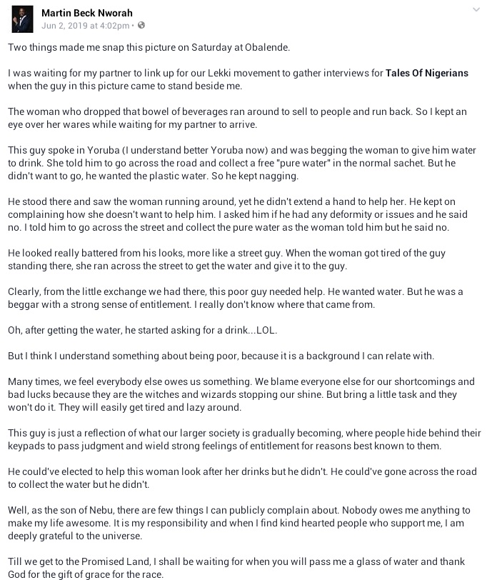 A facebook user identified as Martin Beck Nworah took to the platform to share his interesting encounter with a beggar with a “strong sense of entitlement”.