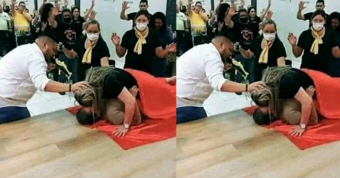A church has reacted after a photo showing two people laying on each other on the church’s altar while a pastor and several church members put out their hands towards them, went viral and sparked outrage online.