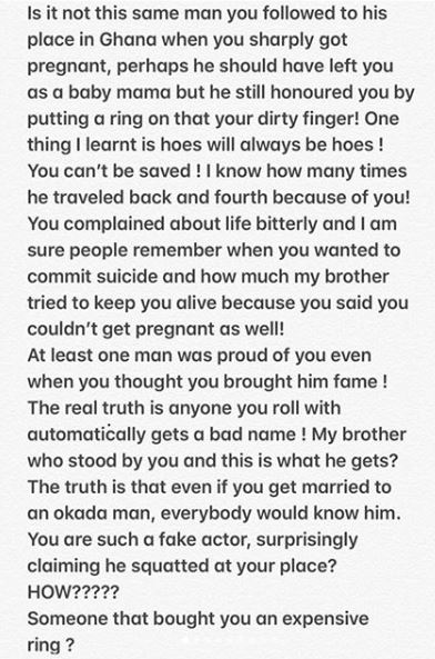 Is it not this same man you followed to his place in Ghana when you sharply got pregnant, perhaps he should have left you as a baby mama but he still honoured you by putting a ring in that your dirty finger!