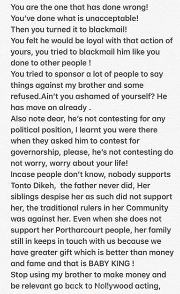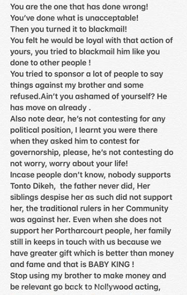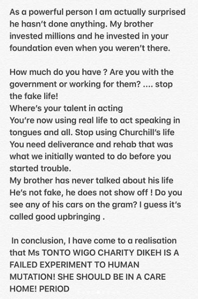 Churchill’s brother who is not pleased with the statement took to his Instagram page to blast Tonto Dikeh.