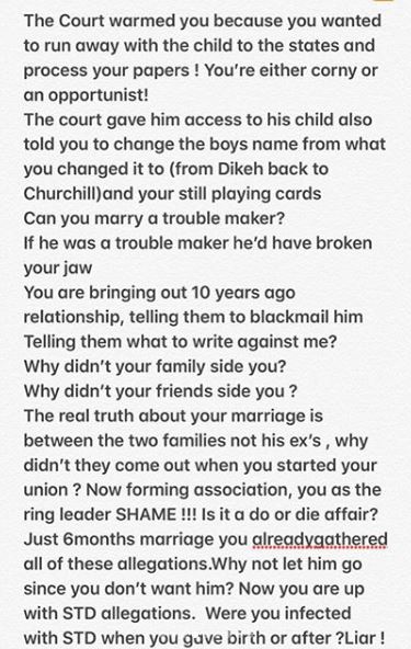“Why not let him go since you don’t want him? Now you are up with STD allegations. Were you infected with STD when you gave birth or after ? Liar !