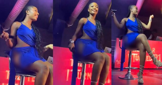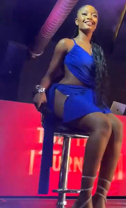 In the viral video, the artiste was captured sitting on a chair, wearing a short and revealing outfit after arriving at her listening party.
