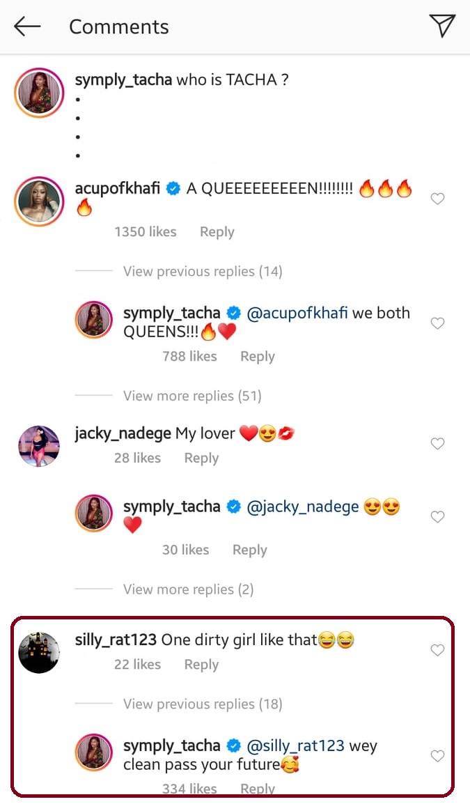 Tacha, who had been replying to the positive comments she’d been receiving didn’t leave this negative one out as she fired back at the troll, noting that she is cleaner than the troll’s future.