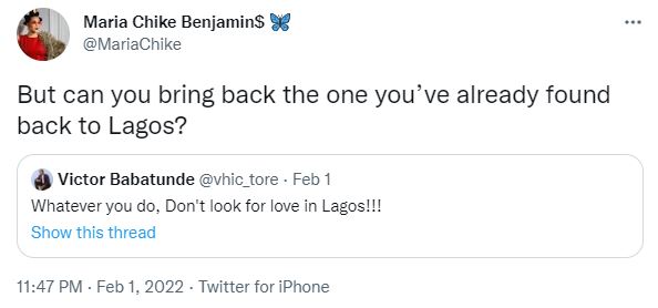 She stated this while reacting to a viral tweet where a Nigerian Twitter user advised people not to search for love in Lagos.