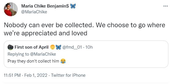 Big Brother Naija star, Maria Chike Benjamin, has averred that no one can be ‘collected’ from their partner except the person decides to leave the relationship.