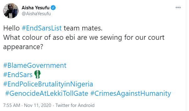 “Hello #EndSarsList team mates. What colour of aso ebi are we sewing for our court appearance? #BlameGovernment #EndSars #EndPoliceBrutalityinNigeria #GenocideAtLekkiTollGate #CrimesAgainstHumanity”.