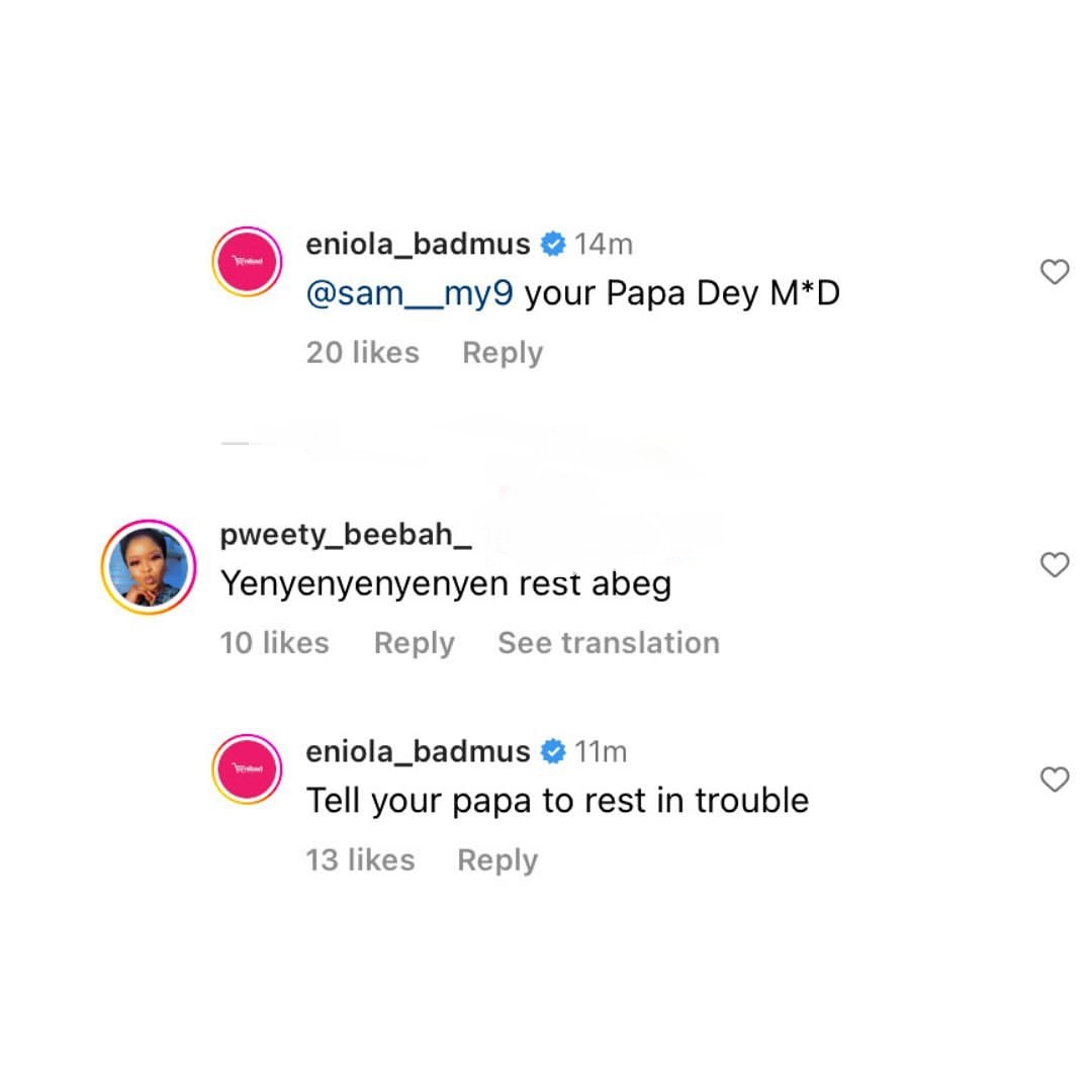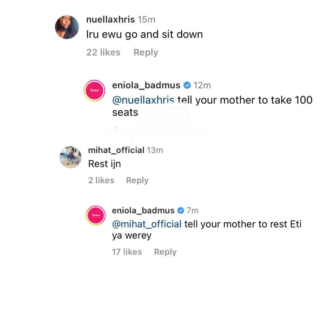 True to her words, Eniola took her time to give befitting responses to everyone who left comments that she found offensive in the comment section of the post.