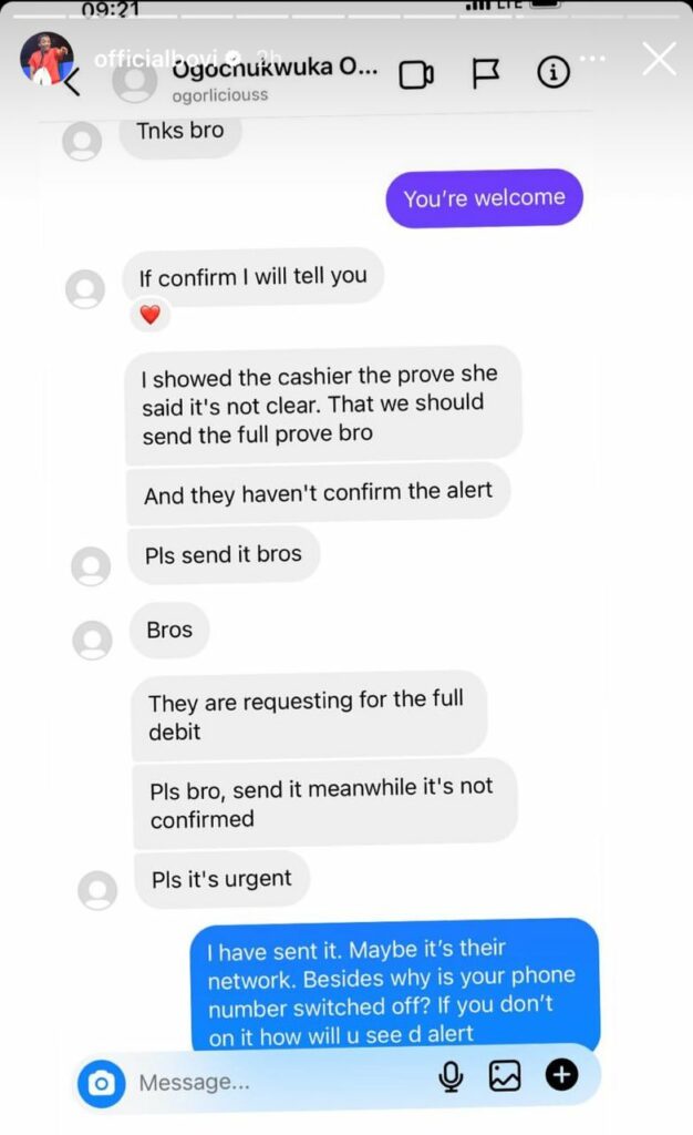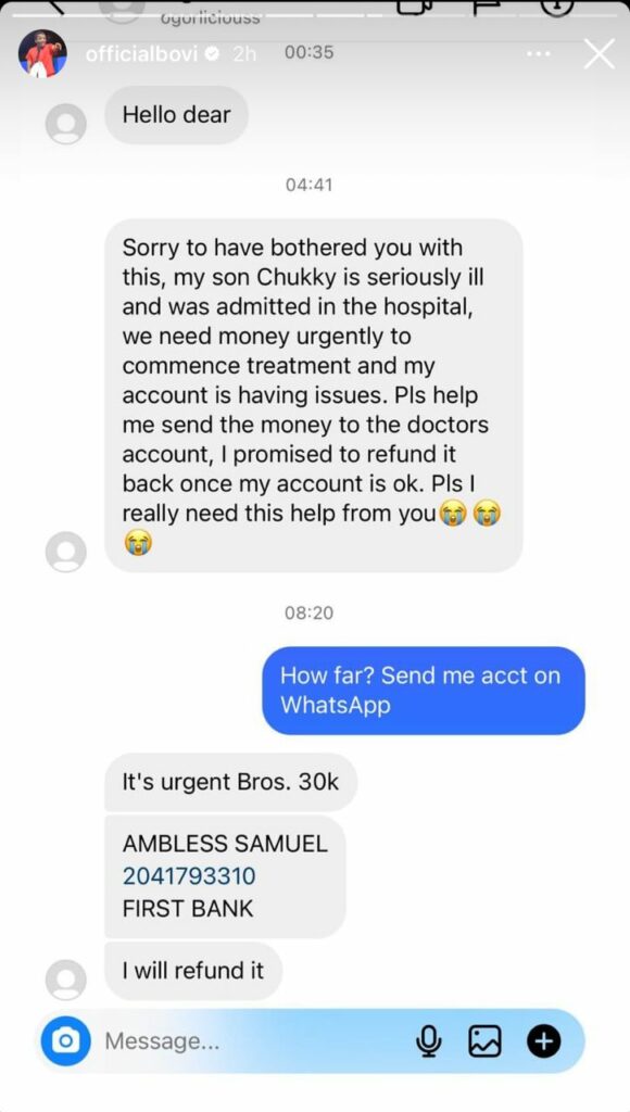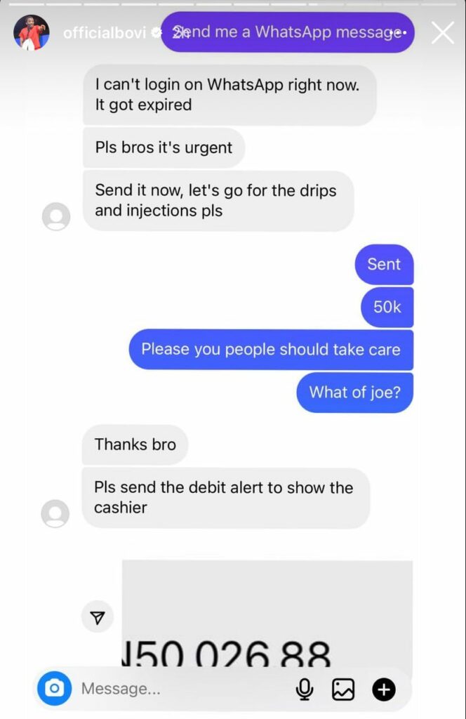 The actor took to his Instastory to share screenshots of their conversation which he said was suspicious from the get go.