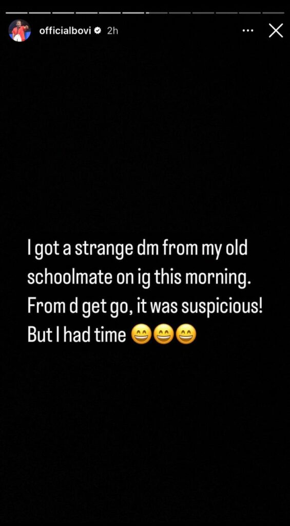 Nigerian comedian and actor, Bovi Ugboma has shared the interesting exchange he had with a scammer who posed as his former schoolmate.