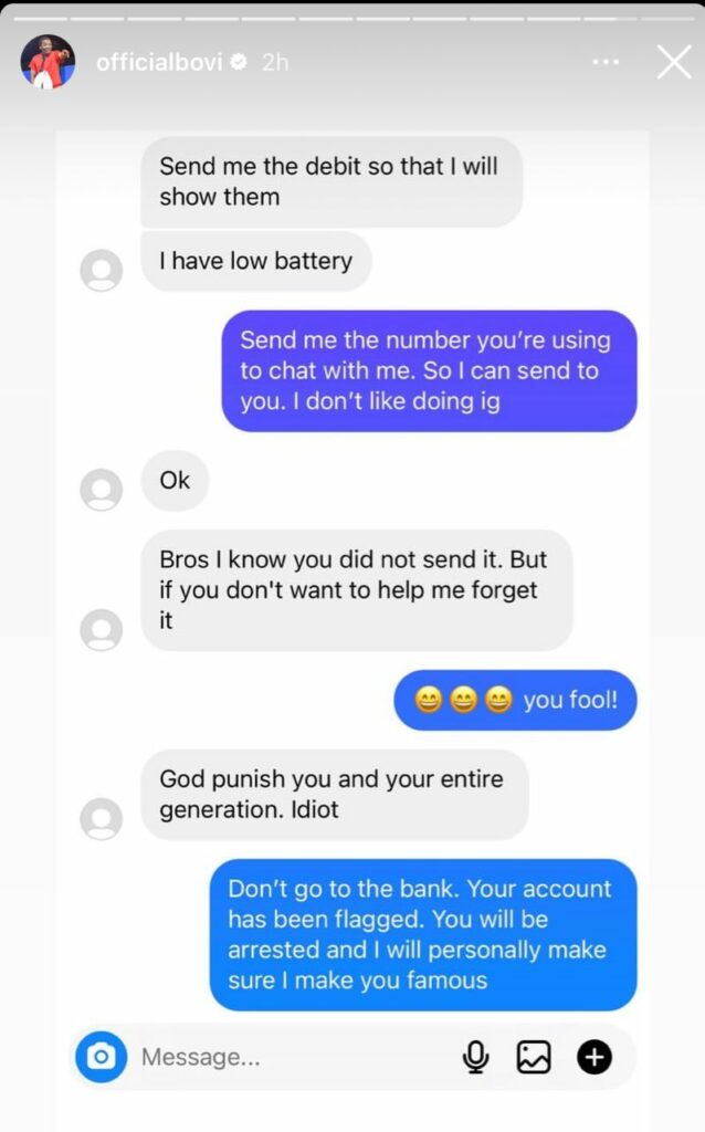 Things went downhill from there and they threw insults at each other, then Bovi revealed that he has reported the scammer’s bank account and he would be arrested if he makes any attempt to go to the bank.
