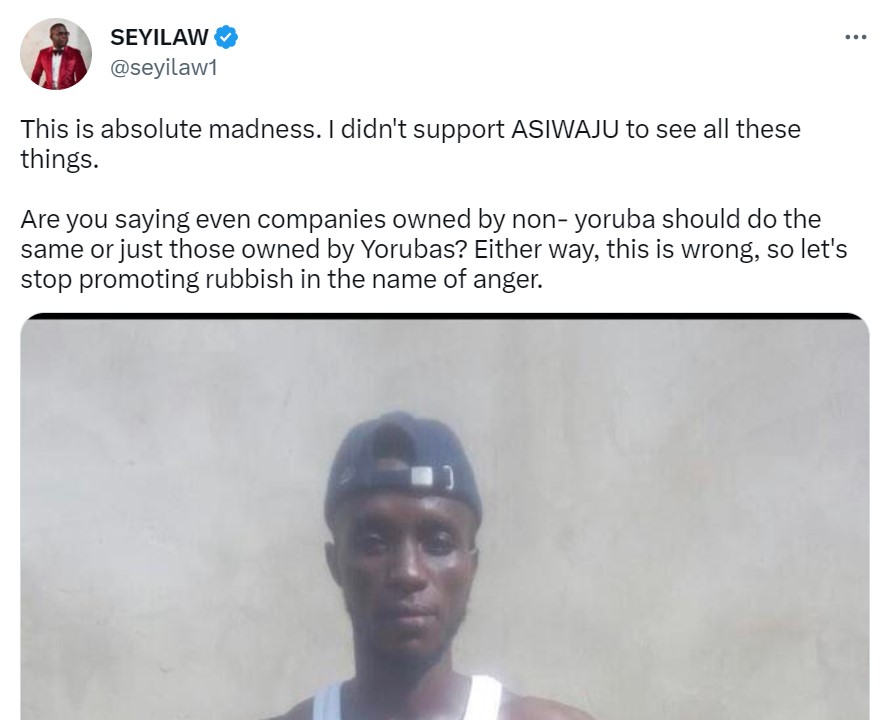 Popular Nigerian comedian, Seyi Law, has reacted to a photo of a man clamoring for tribalism in the recruitment process in Yoruba-owned companies.