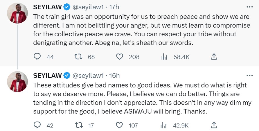The train girl was an opportunity for us to preach peace and show we are different. I am not belittling your anger, but we must learn to compromise for the collective peace we crave. You can respect your tribe without denigrating another. Abeg na, let’s sheath our swords.