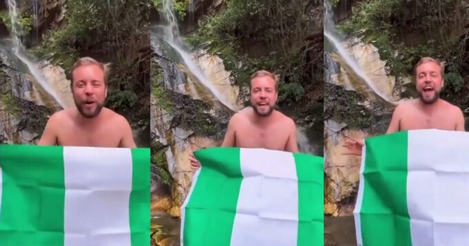 The man, who noted that everything about his trip was fine, held the Nigerian flag while he struck a pose in front of one of the waterfalls in Ekiti state.