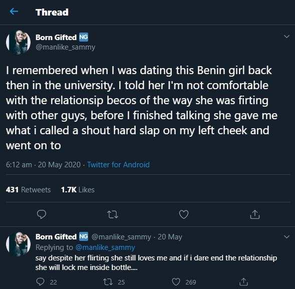 “I remembered when I was dating this Benin girl back then in the university. I told her I’m not comfortable with the relationship becos of the way she was flirting with other guys, before I finished talking she gave me what i called a shout hard slap on my left cheek and went on to say despite her flirting she still loves me and if i dare end the relationship she will lock me inside bottle.”