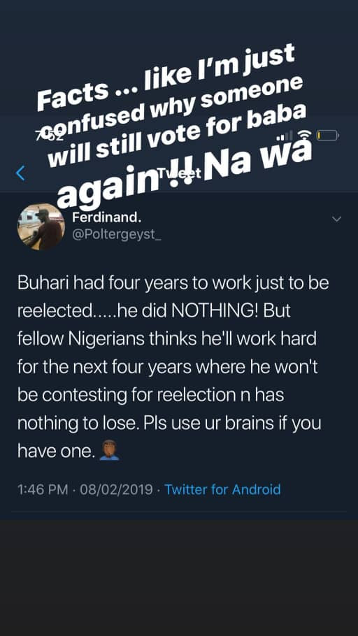 According to the singer, he wonders why anyone will want to re-elect President Buhari. See what he wrote on his insta-stories below;