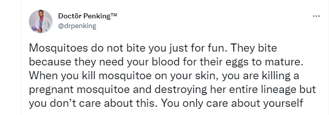 “Mosquitoes do not bite you just for fun. They bite because they need your blood for their eggs to mature. When you kill mosquitoe on your skin, you are killing a pregnant mosquitoe and destroying her entire lineage but you don’t care about this. You only care about yourself”