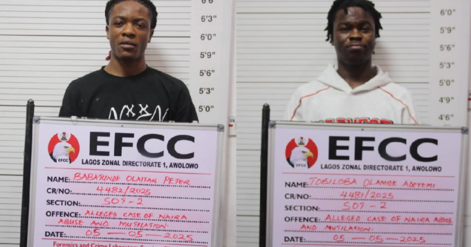 The Lagos Zonal Directorate 1 of the Economic and Financial Crimes Commission, EFCC, on Thursday, May 8, 2025, secured the conviction and sentence of the duo of Babatunde Peter Olaitan and Tobilola Olamide to six months imprisonment each for mutilation of the Naira notes.