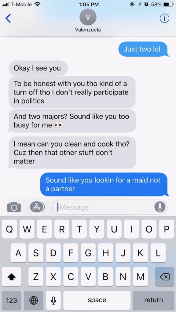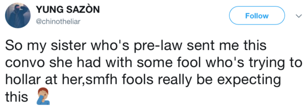 “So my sister who’s pre-law sent me this convo she had with some fool who’s trying to hollar at her, smfh fools really be expecting this ??‍♂️”