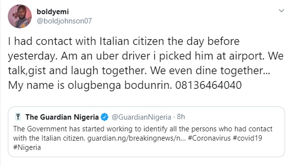 Shortly after the news was made public by the Federal Ministry of Health, a Nigerian man on twitter identified as Olugbega Bodunrin(@boldjohnson07), has come out to make claims that he was the cab driver that conveyed the Italian citizen who was infected with the virus.