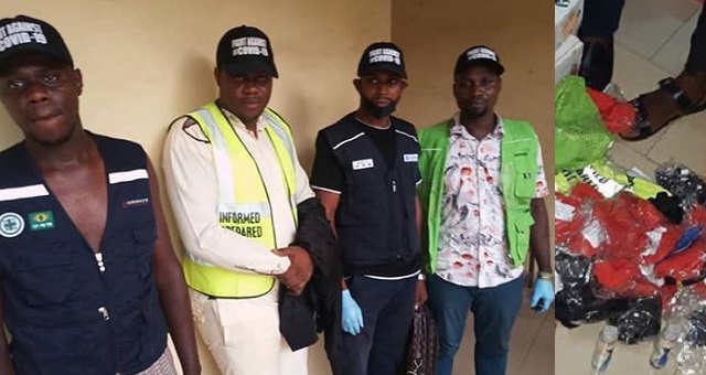 “Suspects who allegedly claimed to be officials of the Ministry of Health, fully kitted with reflective jackets and caps with inscriptions “FIGHT AGAINST COVID-19” were arrested with flyers, hand sanitizers and face masks which they produced locally under unhygienic conditions and selling the products to the unsuspecting members of the public as well as distributing same to various outlets in Onitsha before their arrests.