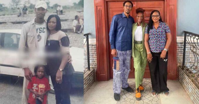 In a heartwarming side-by-side comparison, the corps member posed with her parents, just as they did when she was a child.