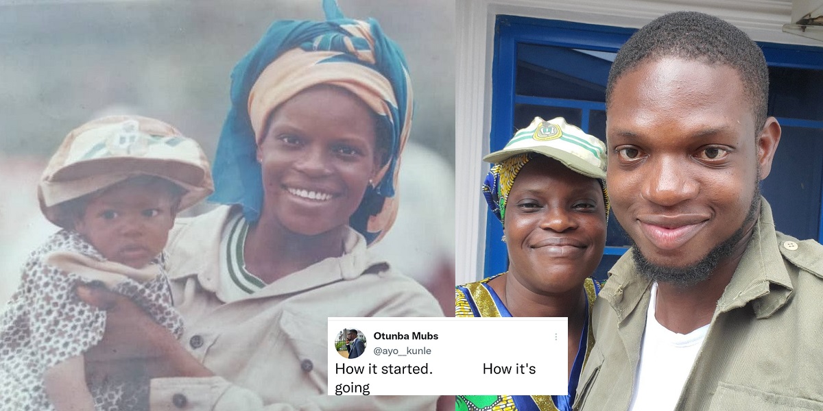The young man, identified as @ayo__kunle on Twitter, took to the microblogging platform to share a throwback photo his mother snapped with him when she was serving the country years ago.