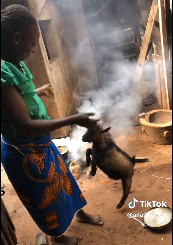The video begins with a woman cooking near a fireplace, only to find herself locked in a funny battle with her determined goat.