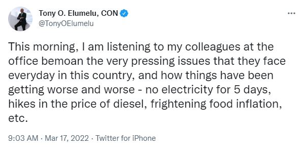 Taking to Twitter today, March 17, Tony Elumelu said he heard his colleagues at the office complaining about the issues they’ve been facing in the country and he couldn’t help but wonder why 90% of Nigerians are in abject poverty when the country is rich in natural resources.