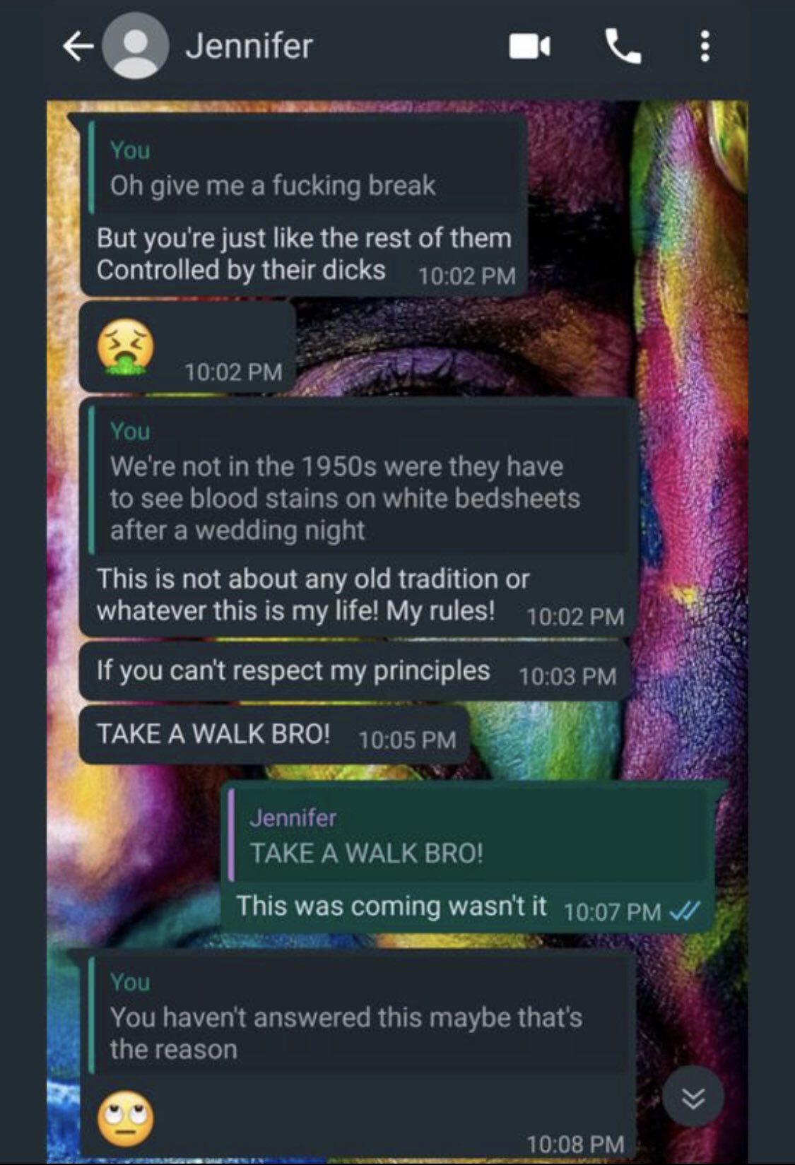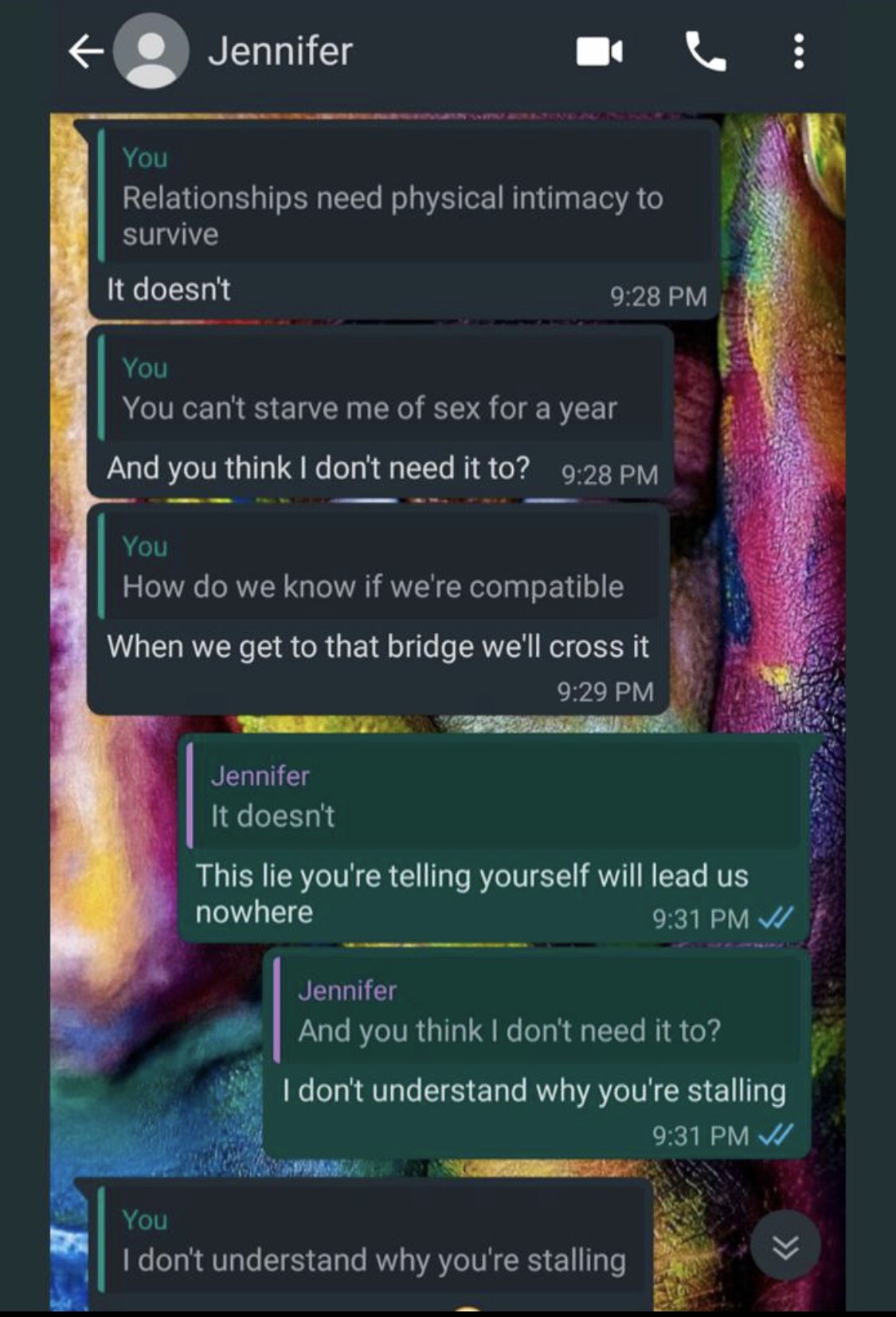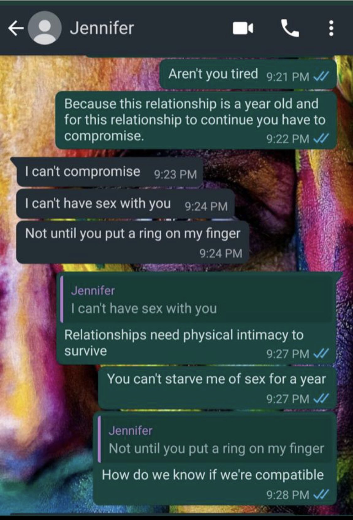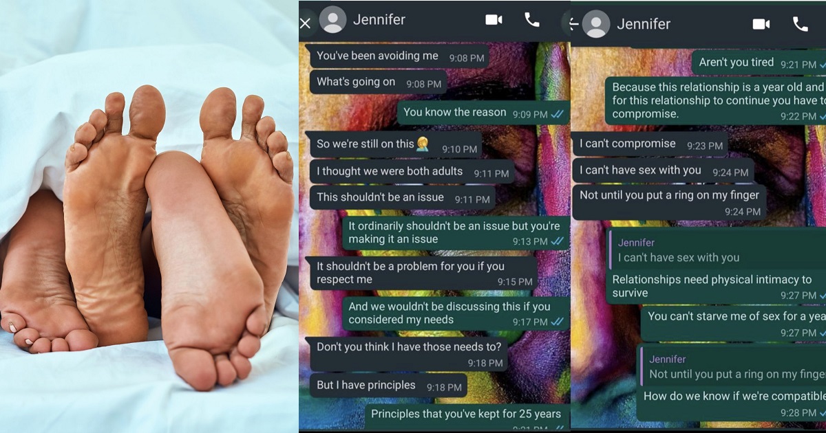 In the chat, the man said he was tired of being celibate and wants to consummate their relationship but the lady maintained that she doesn’t want them to have sex without getting married first, and berated him for not respecting her enough to wait until marriage.