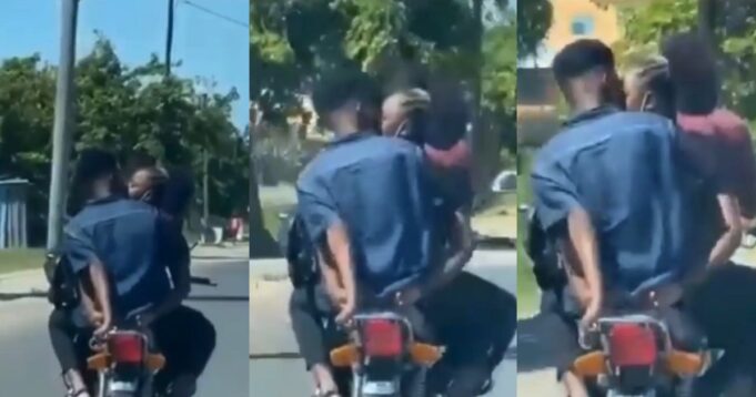 A couple were spotted in a now viral video locking lips while sitting on a moving motorcycle on a busy road.