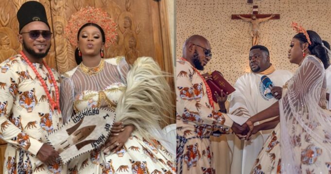 A Nigerian couple have gone viral stir online by wearing isi-agu for their church wedding.