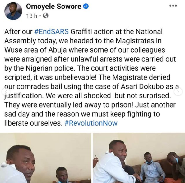 In an update shared on his Facebook page, Sowore stated that the arrested protesters were arraigned before a Magistrate court and the court denied them bail and ordered they be remanded in prison custody.