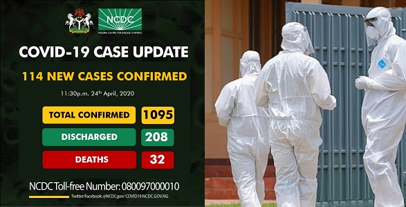 As at 11:30 pm 24th April there are 1095 confirmed cases of #COVID19 reported in Nigeria.