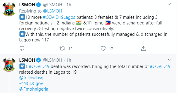 Lagos State has recorded another COVID-19 death, bringing the total number of deaths in the state due to the pandemic to 19.