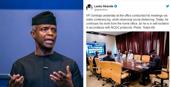 Osinbajo’s media aide, Laolu Akande confirmed that his principal went into self-isolation after it was reported he didn’t show up in his office on Tuesday March 24.The Vice President will continue working from his home office in compliance with NCDC’s directive.