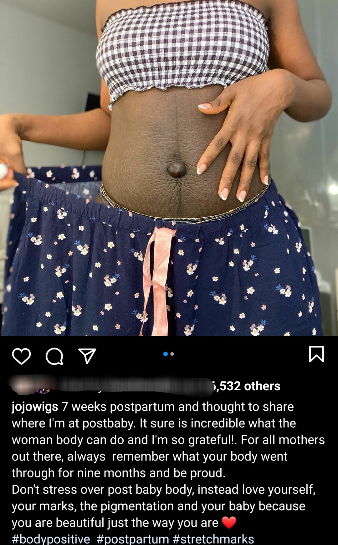 The first time mum who welcomed her child with the comedian in December, revealed she’s 7 weeks post-partum and decided to share photo of her bare belly as a motivation to other mothers.