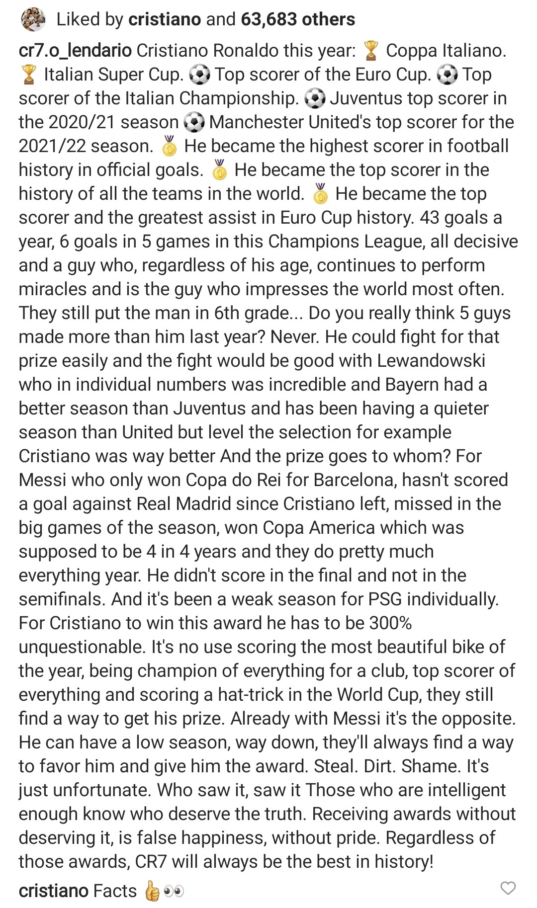 Following Messi’s win, a fan account of Ronald called ‘Cristiano Ronaldo – The Legendary’, shared an Instagram post claiming Messi didn’t deserve the win.