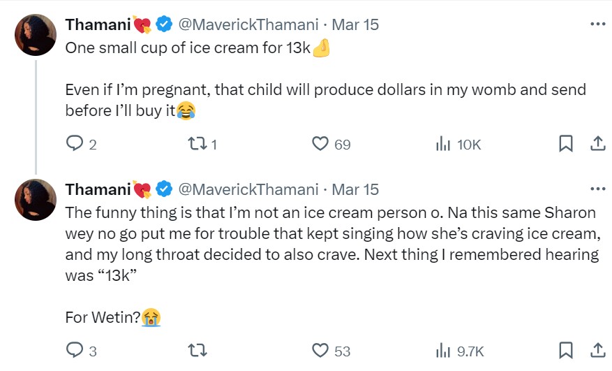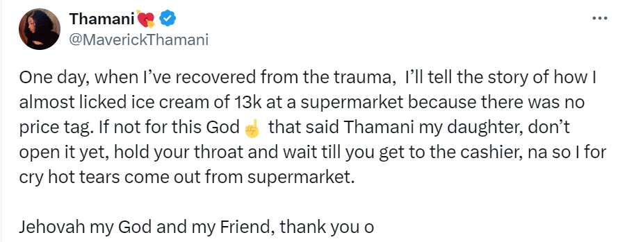 “One day, when I’ve recovered from the trauma, I’ll tell the story of how I almost licked ice cream of 13k at a supermarket because there was no price tag. If not for this God that said Thamani my daughter, don’t open it yet, hold your throat and wait till you get to the cashier, na so I for cry hot tears come out from supermarket. Jehovah my God and my Friend, thank you o One small cup of ice cream for 13k Even if I’m pregnant, that child will produce dollars in my womb and send before I’ll buy it The funny thing is that I’m not an ice cream person o. Na this same Sharon wey no go put me for trouble that kept singing how she’s craving ice cream, and my long throat decided to also crave. Next thing I remembered hearing was “13k” For Wetin?“
