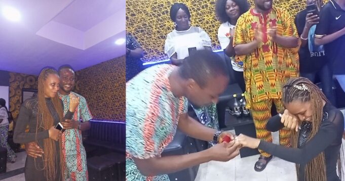 A man from Bayelsa State, Comrade Ineintiemo Michael Suotongha proposed to his girlfriend, Inatimi Joy in Yenagoa but what really got people talking was the fact that she knelt down to accept the proposal.