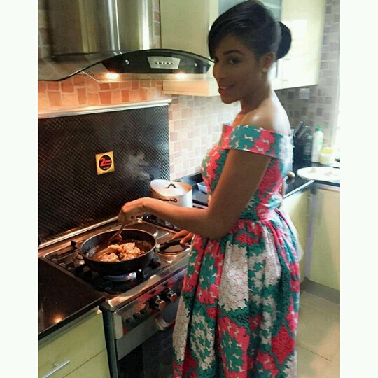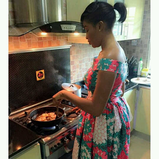 The beautiful business woman who has a brawl on her schoolgirl look with Yvonne Nwosu, shared the stunning photos of herself as she cooked. She wrote: