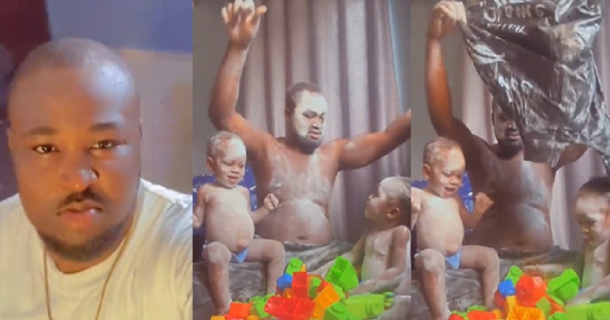 According to him, things started off with both babies crying, so he got creative, doing what any desperate dad might do to keep them entertained.