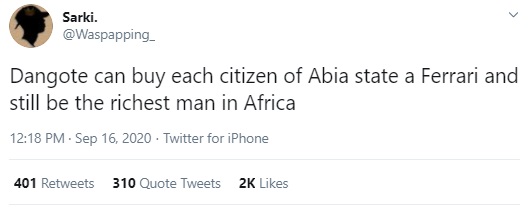 However, @Waspapping_ in a recent tweet, said; “Dangote can buy each citizen of Abia state a Ferrari and still be the richest man in Africa.”